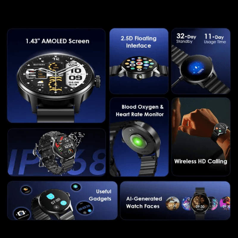 Oraimo Watch 5R Pro is a premium smartwatch built for users who want an advanced AMOLED display, smooth interaction, and durable performance in a modern design. For users searching for the Oraimo Watch 5R Pro price in Pakistan, this smartwatch features a 1.43-inch AMOLED screen with a 2.5D floating interface that delivers sharp visuals and a refined user experience.